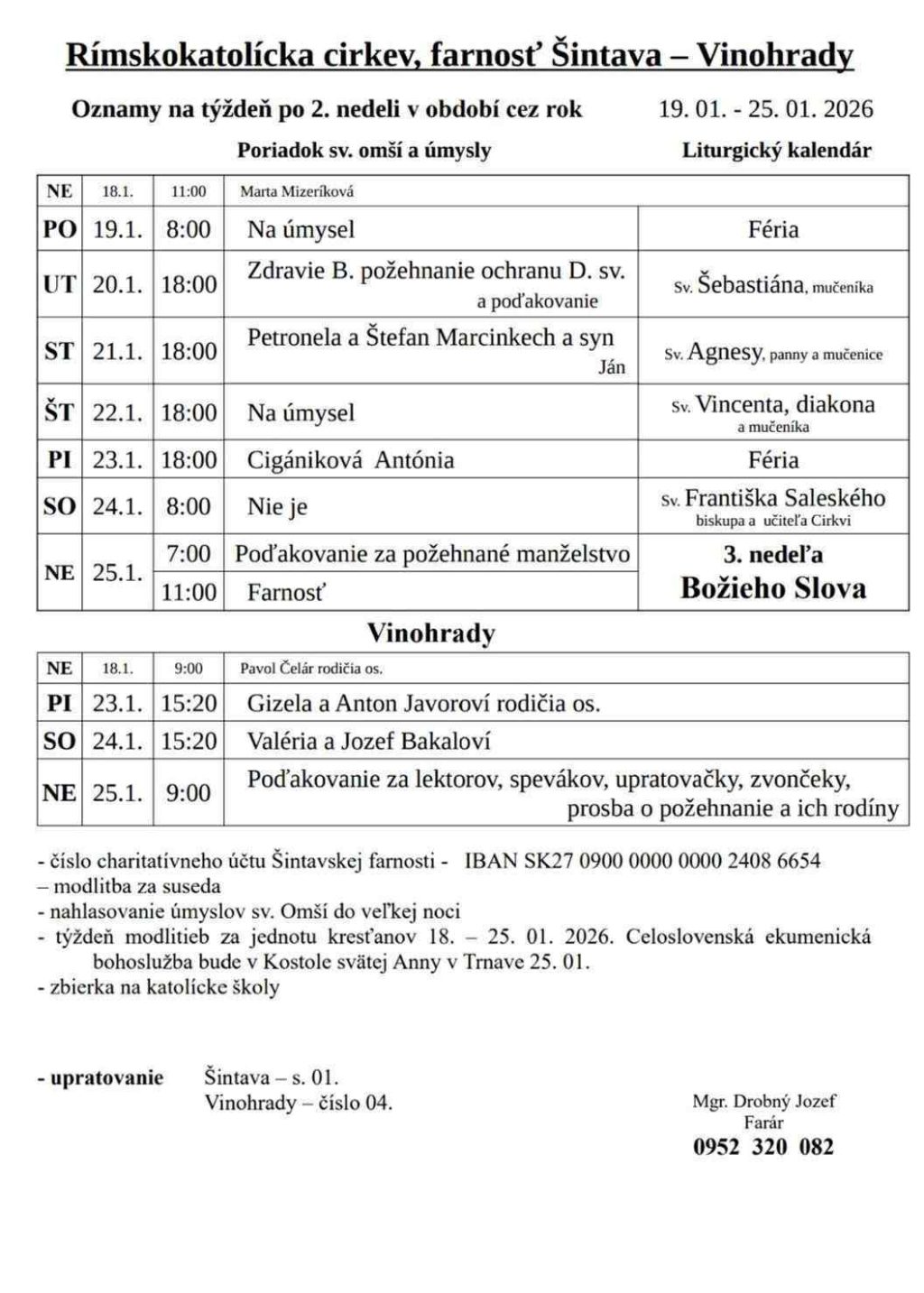 Šintava: Farské oznamy od 19. do 25.1.2026