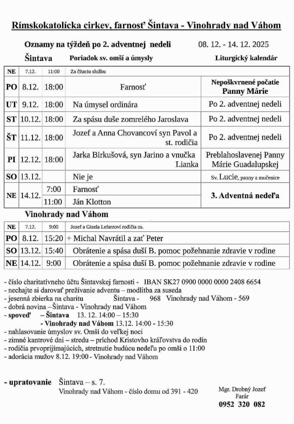 Šintava: Farské oznamy od 8. do 14.12.2025